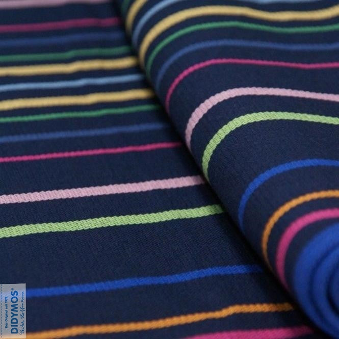 Narrow stripes in blue, orange, red, yellow, light green and pink on a dark blue background.