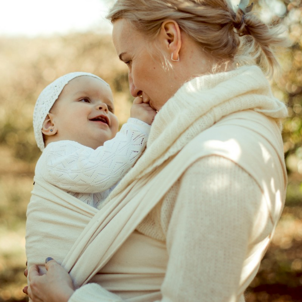 Our Didymos woven wraps are of the highest quality on the market. The Crêpe Merino Silk is a creamy white natural and soft blend of mulberry silk, fine Merino wool, and 100% organic cotton fabric. Though lightweight and soft out of the box, the fabric is sturdy and provides perfect support in width and length, tightly woven to carry from newborn all the way to toddlerhood. With its inherent diagonal stretch, it is moldable and a bit grippy to allow for comfortable and precise tying of front, hip and back carries.